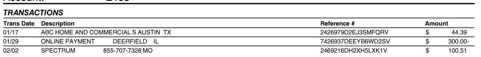 이 항목은 거래/구매 내역을 의미한다. Credit card를 한번 쓸 때마다 그 내용을 기록하는 것이다. 여기에는 사용한 내역 뿐만이 아니라 지난 달 갚은 금액, 그리고 refund 된 항목도 나타난다. 만일 금액 앞에 "-"가 있으면 이건 refund/credit/payment 된 내역을 나타낸다.