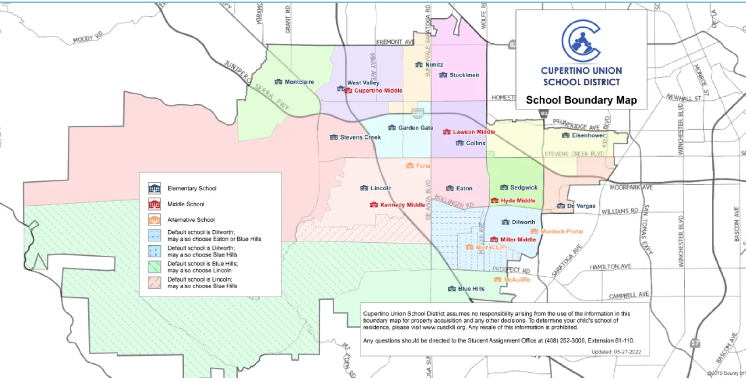 이 지도에는 행정구역 구분이 잘 나타나 있지 않지만 위 지도는 City of Cupertino, City of Sunnyvale, City of San Jose, City of Saratoga의 일부분들을 포함하고 있다. 그리고 한가지 특이한 점은 Cupertino Union School District (Cupertino 학군)은 초등학교와 중학교만을 담당하고 있다.