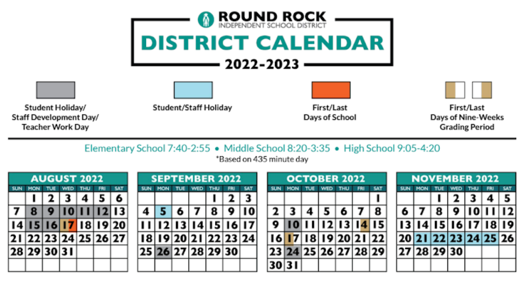 매년 3월에 새 학년/학기가 시작하는 한국과는 달리 미국은 8월 말에 새 학년이 시작한다. 그래서 2022 학년도가 아니라 2022-2023 학년도로 표시한다. 예를 들면 내가 지금 살고 있는 주소지의 학군인 Round Rock Independent School District (RRISD) 홈페이지에 가보면 다음과 같이 2022-2023 학년도의 학교 스케줄이 포스팅 되어 있다.