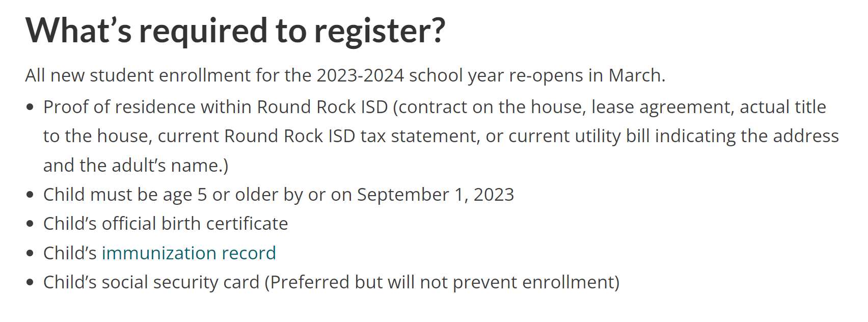 한국에서는 주민등록이라는 것이 있기 때문에 아이가 언제 취학연령인지 알 수가 있어 동사무소에서 취학통지서가 오지만 미국에서는 주민등록이라는 것이 없기 때문에 가을에 새 학년이 시작될 때 이 연령 기준에 맞으면 부모가 알아서 입학 등록을 해야 한다. 사립의 경우는 시기가 학교마다 다를 수 있지만 공립학교의 경우 해당 학군 홈페이지에 가면 언제 등록을 시작하는지 알 수가 있다. CA에 있을 때 아이들 세명 모두 2월 중순쯤 등록을 했는데 지금 살고 있는 RRISD 홈페이지를 찾아 보니 다음 학년도인 2023-2024 학년도는 7월, 그리고 내년 3월에 등록을 받는다고 되어 있다.