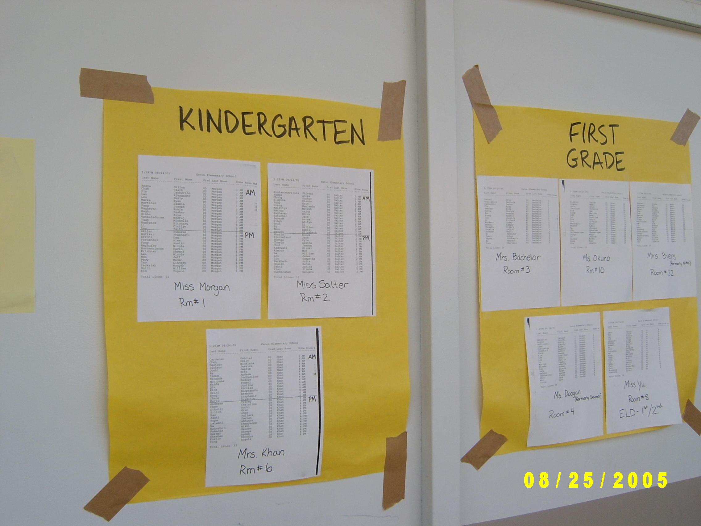 San Jose/CA에서는 보통 학교 시작하기 전 1주일 전 쯤에 선생님들이 모여 반배정을 한다고 들었다. 그리고 그렇게 결정된 반을 학교 게시판에 개학 전날 5시쯤 붙여 놓는다. 그러면 저녁 때쯤 학교에 가서 어느 반으로 배정이 되었는지, 그리고 교실 번호를 찾아 첫날 등교하면 된다. 첫 날이라고 딱히 전교생이 모두 강당에 모이거나 하는 일은 없고 그냥 바로 배정된 반으로 가면 된다.