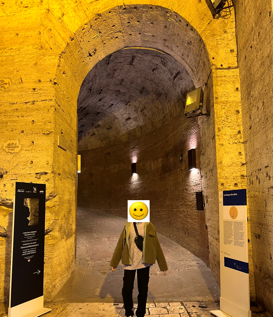 이렇게 지하로 내려 왔다가 다시 올라가는 이 길은 영묘가 그 기능을 잃고 버려지고 약탈 당할 때 흙더미에 파묻혀 있었다고 한다. 그 후 이 곳이 산탄젤로 성으로 바뀐 후 나중에 발굴이 이루어진 것이라고 한다. 그래서 산탄젤로 성 안으로 들어가는 방법이 성체로써 기능을 할 때의 입구가 아닌 이렇게 영묘일 때 시절로 돌아가 올라 가도록 되어 있는 건 상당히 영리한 관람 동선이라고 생각한다. 이 장소는 산탄젤로 성이라는 성체로만 알려져 있지만 사실은 이전에 다른 건물, 즉 하드리아누스 영묘였다는 것을 말로써가 아니라 체험하게 함으로써 알려주고 있기 때문이다.