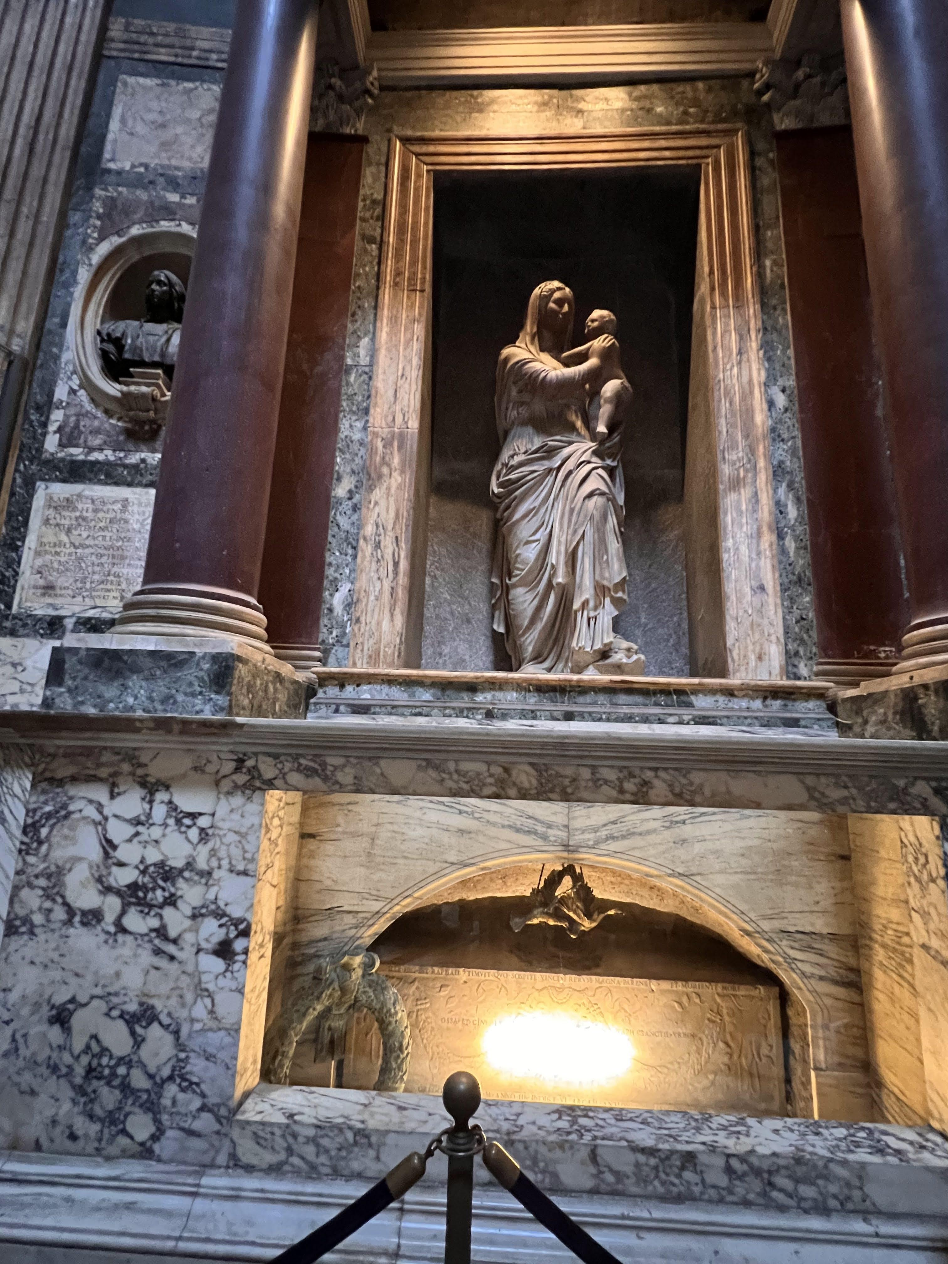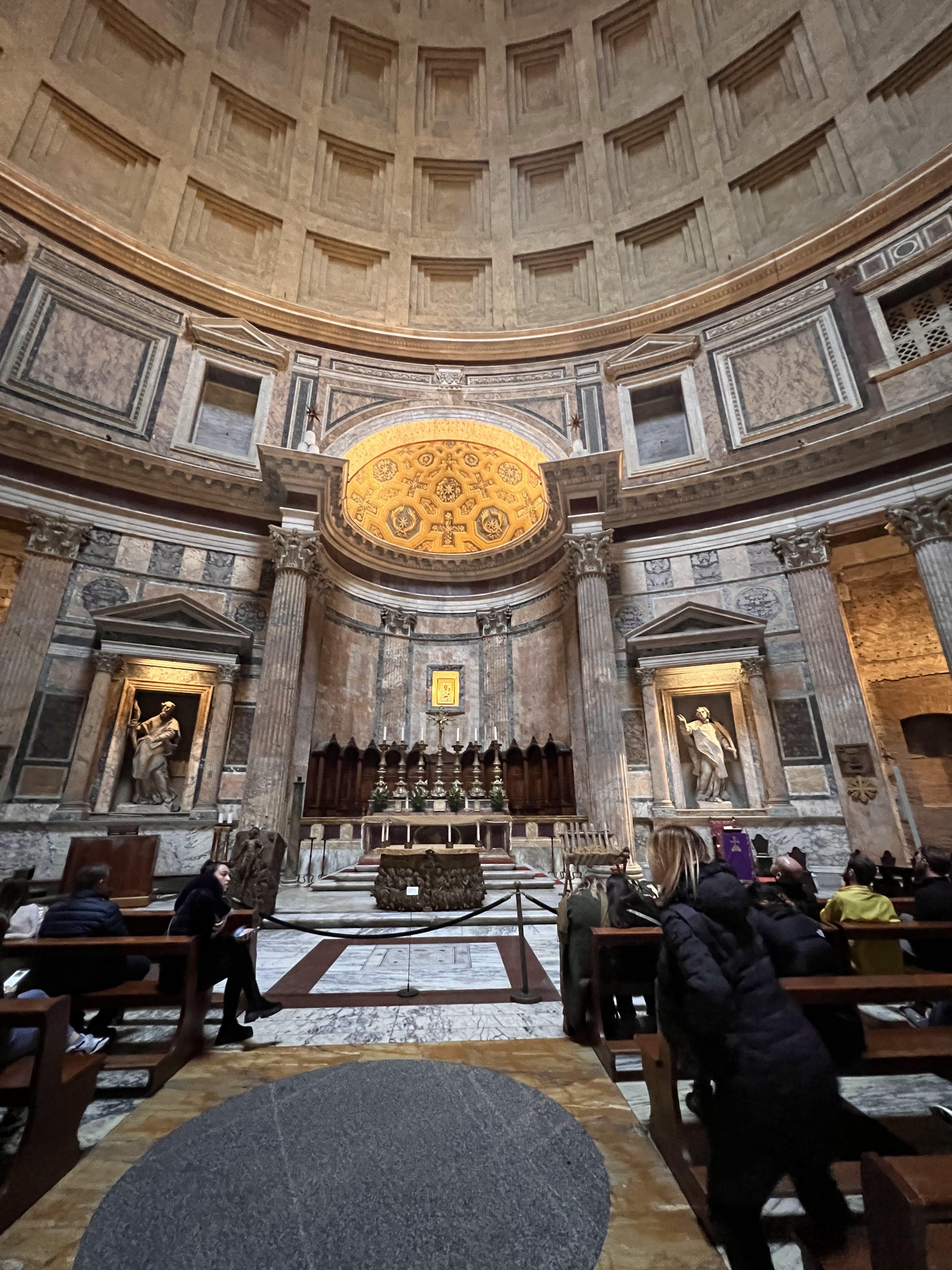 고급 자동차로 유명한 롤스로이스의 전면 그릴 디자인이 이 판테온의 정면 열주 모양을 본 땄다고 하는데 대부분의 사람들은 입장권을 받아 들자마자 안에 들어가는 것만 생각하는지라 판테온의 외부 열주 부분에 대해서는 잘 언급하지 않는 편이다. 나도 솔직히 외부 부분은 자세히 들어다 보지도 않았고 기억이 나는 부분이 있지도 않는다. 나도 바로 판테온 안으로 입장해 버렸다. 내부는 잘 알려지다시피 둥근 형태로 돔 부분은 상당히 높은 곳에서 시작하고 있다. 고개를 바짝 들어 올려다 보지 않는다면 내가 어떤 돔 아래 서 있다는 느낌이 들지 않을 정도이다.
