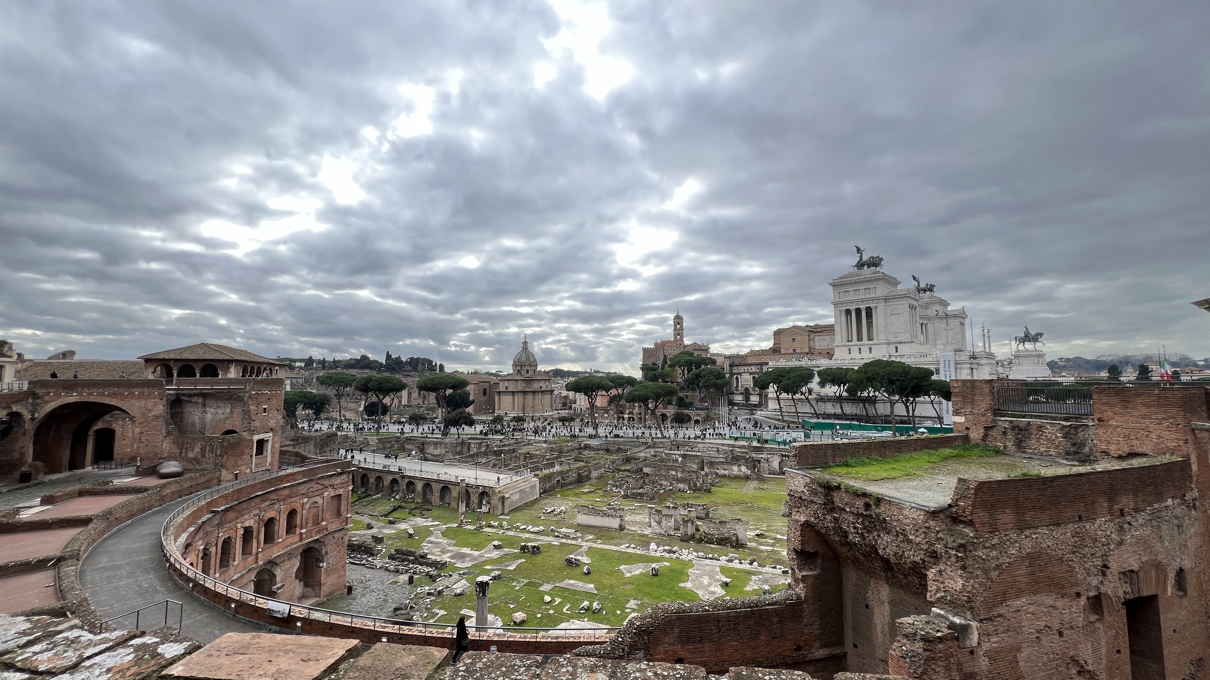들어 갈 때 신경을 별로 쓰지 못했는데 이 박물관의 정식 이름은 "트라야누스 시장 포리 임페리알리 박물관 (Mercati di Traiano Museo dei Fori Imperiali)"이다. 우리가 들어간 입구쪽은 트라야누스 시장의 뒷편에 해당하는 곳이었고 회랑 구역을 지나가면 위 사진에 보이는 트라야누스 시장 건물의 맨 꼭대기, 옥상 테라스 부분으로 나오게 된다. 박물관 입구가 전체 유적지의 뒷편에 있는 셈이라 그 입구에서만 보면 전체 유적지를 모르고 입장하게 되어 나처럼 당황하게 된다. 이 입구가 있는 곳은 과거에 로마인들에게 구제 곡물을 나누어 주던 장소라고 한다.
