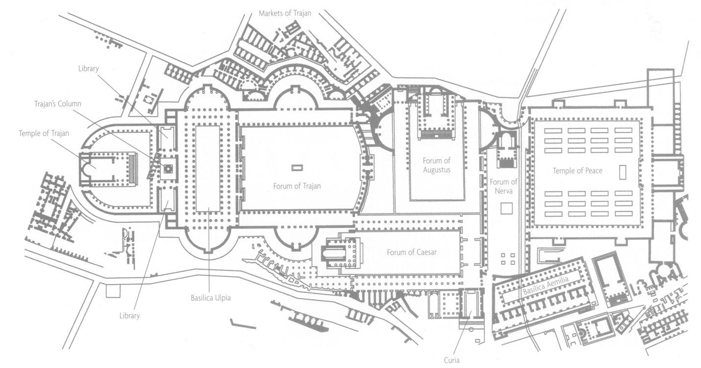 트라야누스 시장이라고 트라야누스 황제의 이름이 붙었으니 당연이 이 시장 건물은 트라야누스 포룸과 함께 만들어진, 그리고 그 옆에 나란히 있는 건물이다. 위 조감도 도면을 보면 알겠지만 시장의 둥근 부분도 트라야누스 포룸이 둥근 에세트라 모양으로 툭 튀어 나온 것과 맞물리도록 설계되었기 때문이다. 그래서 트라야누스 시장 박물관에서 나오자 마자 바로 눈 앞의 유적이 트라야누스 포룸 유적이고, 그 중간에 높다랗게 서 있는 원기둥을 바로 볼 수 있었다.