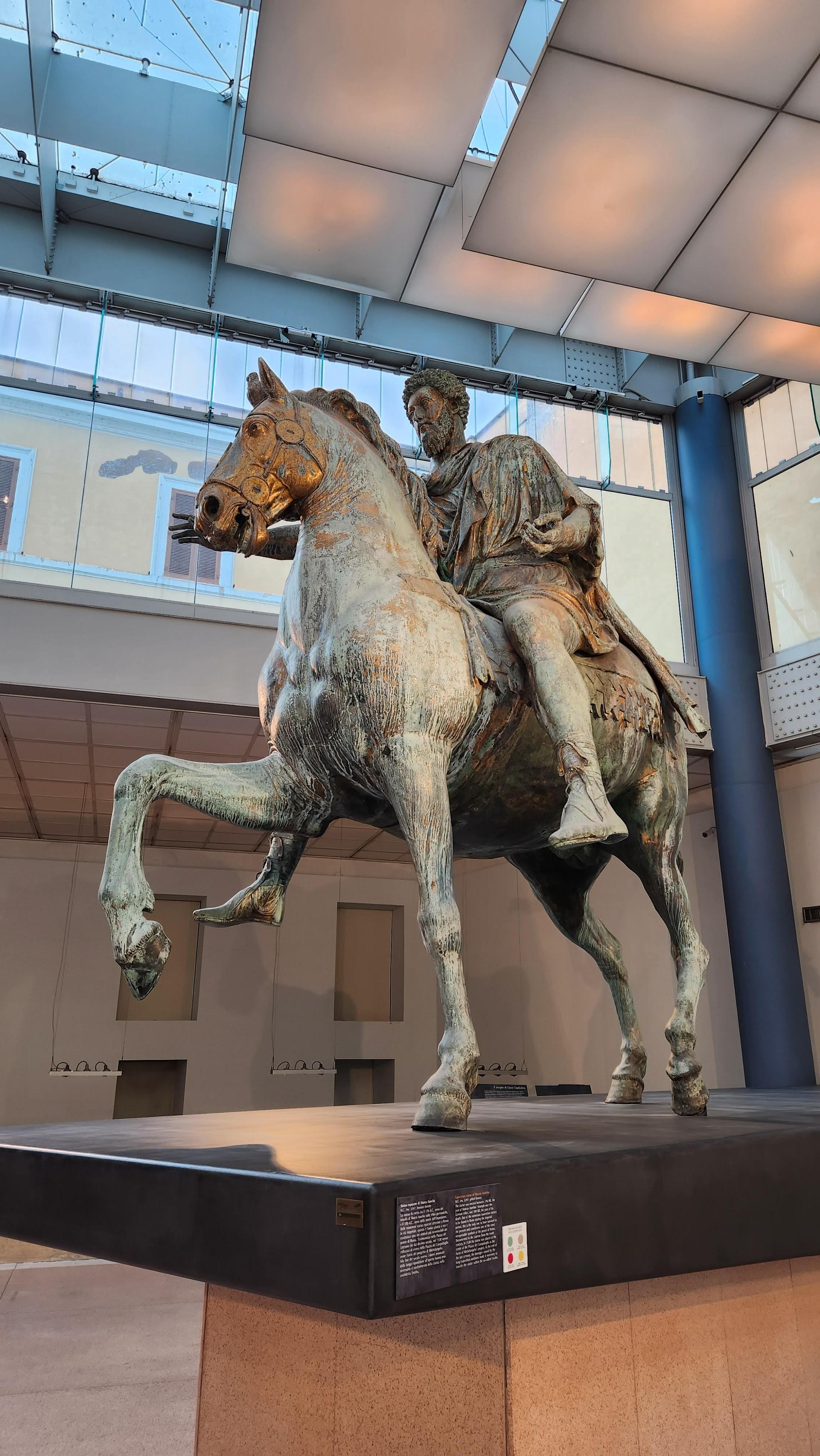 거대한 전시 공간에서 제일 먼저 눈에 띄이는 것은 카피톨리노 광장에서 보았던 마르쿠스 아우렐리우스 기마상의 원본이다. 처음부터 이 원본이 그 광장에 있었지만 비를 맞고 새들의 오물을 뒤집어 쓰기 시작하면서 훼손되기 시작했고 그래서 어쩔 수 없이 복제품을 만들어 광장에 전시했고 원본은 이렇게 안전하게 실내에서 관리를 받게 된다. 피렌체에서 다비드 상의 경우와 마찬가지라고 보면 된다. 오히려 이런 경우에는 바로 눈 앞에서 자세히 볼 수 있어 반가운 상황이다.