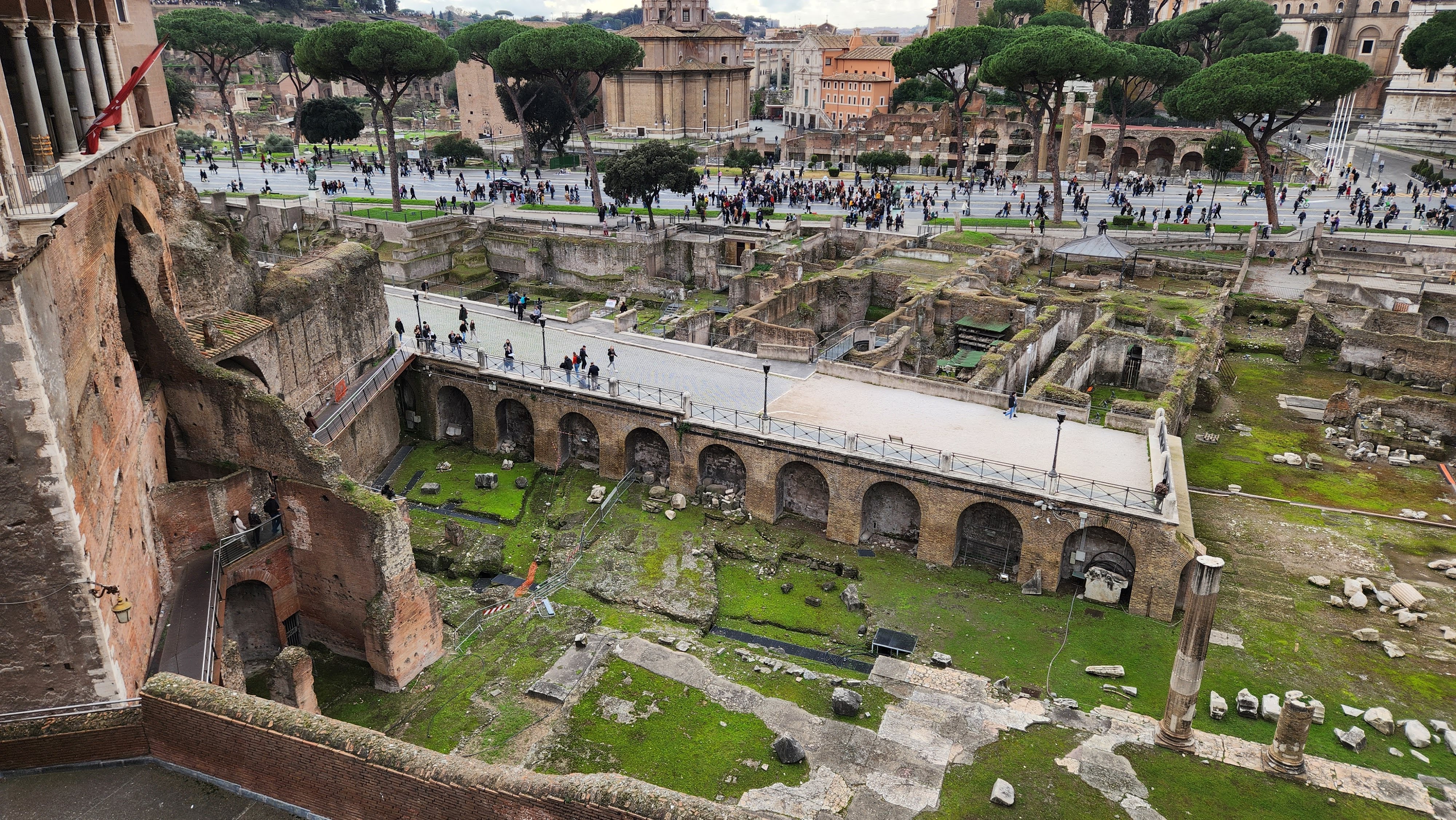 트라야누스 시장 옥상 테라스 부분에서 바라 보면 길 건너 포로 로마노 유적지가 보이고 그 사이에 다시 거대한 유적지 터들이 보인다. 이곳에 "카이사르 포룸", 아우구스투스 포룸", 그리고 이 아치형 시장 건물과 어울리는 반원형 에세트라를 가진 "트라야누스 포룸"이 있었다. 물론 지금은 기단이나 일부 기둥들만 볼 수 있어 어땠을지 상상이 잘 되지 않는다. 그 유적지를 보고 있노라면 100% 원형에 가깝지는 않더라도 아직도 이 정도 유지하고 있는 트라야누스 시장 건물이 대단하다는 생각이 든다. 원래의 모습을 떠 올려 보려면 여전히 상상 더하기라는 숙제가 남아 있지만 그래도 상상의 기초는 제공해 주고 있으니 말이다. 그래서 저 중간에 보이는 횡한 유적지를 보며 아쉬움이 더 남는다. 건물 외벽이라도 남아 있었더라면 얼마나 더 멋있었을까 하고. 하지만 2000년이 넘는 시간 동안 그런 것들이 남아 있으라고 바라는 건 너무 욕심인지도 모르겠다.