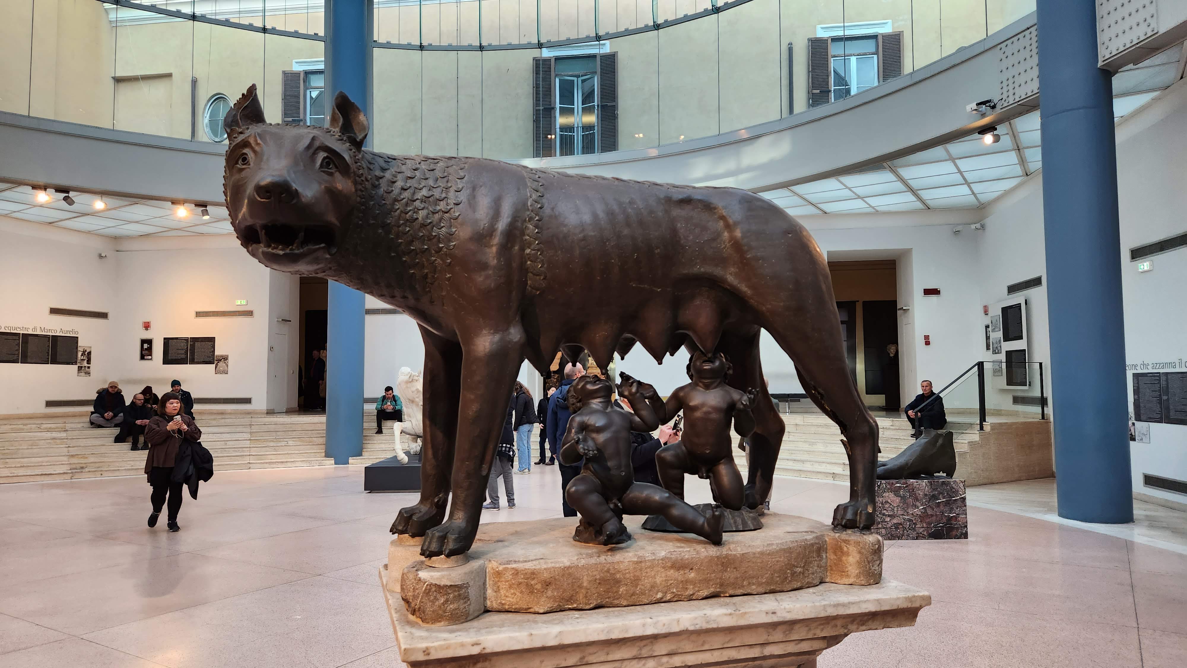 한국에는 단군 신화가 있듯이 로마에도 건국 신화가 있다. 단군은 하늘에서 내려온 환웅의 아들이라는 설정처럼 건국 신화의 시조는 대체로 그 뿌리가 신인 경우가 많다. 로마의 경우도 그 시조가 되는 두 사람, 로물루스와 레무스도 전쟁과 농업의 신 마르스의 아들로 설정되어 있다. 두 사람은 쌍둥이로 로마의 남동쪽에 위치한 알바 롱가 (Alba Longa) 지역에서 출생했지만 바구니에 담겨 테베레 강에 버려졌으며 로마까지 흘러 내려 왔을 때 늑대가 그들을 데려가 자신의 젖을 먹이면서 키웠다고 한다. 그래서 늑대와 쌍둥이 아이들이 그 밑에서 젖을 받아 먹는 이런 청동상이 생기게 된 것이다. 이 두 쌍둥이중 로물루스가 동생 레무스와의 경쟁에서 이겨 팔라티노 언덕에서 자리를 잡고 초대 왕이 되었다고 한다. 그리고 그 국가의 이름이 로물루스를 따라 로마가 되었다. 신화적, 전설적인 인물이라서 실제 존재가 증명되지는 않았지만 팔라티노 언덕 황궁터에 가면 로물루스가 살았다는 집터가 있다.
