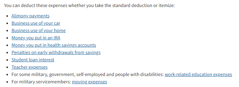 물론 세금 공제가 위 두가지만 있는 건 아니다. 세금은 걷어야 하지만 어느 누구도 세금을 내고 싶어하지 않는다. 그러다 보니 이것저것 빼 주는 것들(deductible)이 생겨날 수 밖에 없다. IRS 페이지에 가면 이를 정리해 놓은 것들이 있는데 일일이 설명하자만 끝도 한도 없으니 몇가지만 살펴보면 다음과 같다.