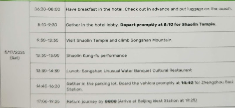 베이징으로 돌아가는 고속열차는 낙양으로 올 때 도착했던 역이 아닌 다른 역에서 타게 된다. 소림사가 낙양 근처이긴 했지만 다른 도시 지역에 속한 지역였기 때문이다. 우리가 향한 역은 정저우(鄭州; Zhengzhou) 기차역이었는데 이 도시 정저우(鄭州; Zhengzhou)가 후난성의 성도 소재지라고 한다. 잘 알지 못하는 지역에서 버스를 타고 이리저리 고속도로 같은 곳을 따라 움직여 어디쯤인지 감을 잡을 수 없을 때 갑작스럽게 도착한 열차역이라 외관도 별로 살펴 보지 못했다. 처음 베이징에서 출발했을 때와 같은 정도의 규모를 가진 커다란 열차역이었는데 마찬가지로 입구에서 간단한 가방검사/검색대를 거쳐 안으로 들어 갔다. 오늘은 토요일이기 때문에 admin 말로는 모두 다 베이징으로 돌아 가지 않고 1/3 정도는 남아서 하루 더 놀다가 돌아 간다고 한다. 젊다는 건 좋은거다.
